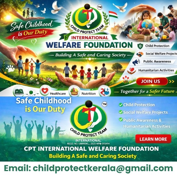 CPT INTERNATIONAL WELFARE FOUNDATION is a registered child protection and social welfare organization committed to safeguarding children and strengthening vulnerable communities. (REGD. NO: U88900KL-2025-NPL-093494) National Committee Office: Manikkoth, Kanhangad, Kasaragod, Kerala – 671316 Our work focuses on child protection, emergency response, awareness programs, healthcare support and nutrition initiatives. We act quickly, operate transparently and work directly at community level to build a safe and caring society. Office Phone: 9446652447 State Helpline: 9447151447 Email: childprotectkerala@gmail.com
