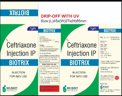 Biotrix is a Ceftriaxone Injection IP supplied by Bio-Inject Healthcare Pvt Ltd, designed for IM/IV use to treat a wide range of bacterial infections. Each ampoule contains 1 gm of Ceftriaxone with stable solvent for injection. The product is intended for professional use under the guidance of a registered medical practitioner.