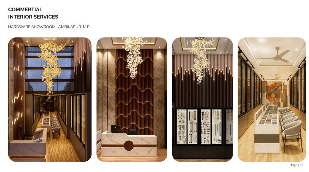 This commercial interior project for a hardware showroom in Ambikapur, M.P. was designed to achieve maximum product visibility, efficient display zoning, and a modern customer-friendly layout. The showroom includes dedicated sections for hardware, laminates, veneers, handles, hinges, profiles, and display storage—each planned with accuracy and visual clarity. Our team created a streamlined layout with precise working drawings, display elevations, and functional circulation planning. Material durability, lighting balance, color coordination, and ergonomic counter design were prioritized to elevate the retail experience. The final output delivers a premium, organized, and high-performing showroom environment with complete turnkey supervision and timely execution.