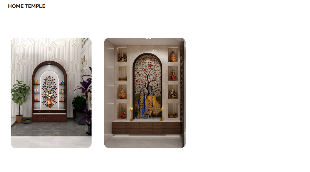 This Home Temple project showcases a beautifully crafted spiritual corner designed with precision and cultural sensitivity. The design features balanced lighting, elegant textures, CNC-cut panels, traditional motifs, and premium finishing materials that enhance the devotional ambience. Storage units, deity placement, backdrop design, and décor elements were planned with accuracy to maintain both aesthetics and functionality. The temple area was crafted to radiate serenity and divine energy, offering the client a peaceful meditation and prayer environment. From layout planning to execution, every detail was completed with meticulous care and high-quality craftsmanship.