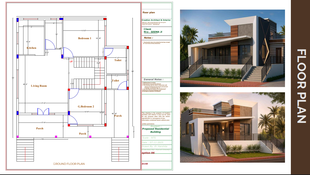 This Residential Floor Plan project includes full technical planning and layout development for optimal space utilization. The design features room zoning, circulation flow, furniture placement, ventilation planning, and structural coordination. Detailed measurements were prepared for all areas including bedrooms, kitchen, living space, toilets, porch, staircase, and corridor connections. The plan ensures practical functionality with structural alignment, accurate dimensions, service placement, and future scalability. Every part of the layout was designed to reflect comfort, efficiency, and long-term usability, forming the blueprint for successful interior and architectural execution.
